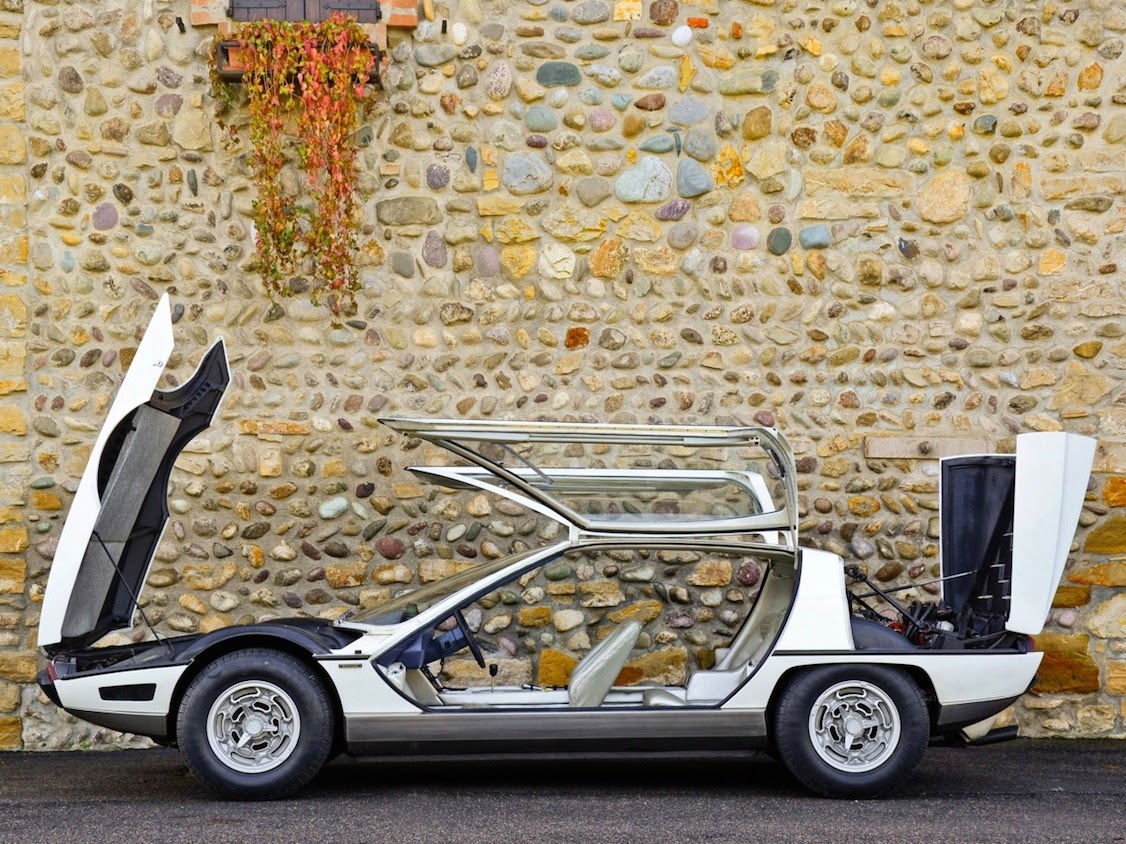 The car's most striking feature is the very airy cockpit with unusually large glass surfaces and huge gullwing doors. Bertone understandably developed an air-conditioning system specifically for the car. The car's sharp lines are complemented by angular forms throughout the design. The nose, for example, sported six square headlights and the rear deck consisted of square aluminium slabs riveted together. The luxuriously appointed interior featured a sizeable dashboard and centre console dominated by hexagonal sections. The same theme is used throughout the cabin from the steering wheel centre and the seat cushions.