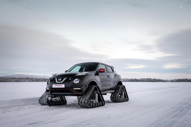 Starting with a capable 2014 Juke Nismo RS AWD (photos below), the team fitted 815-pound (370 kilogram) DOMINATOR Track Systems snow tracks built by a company that got its start in Michigan and now builds track systems for a variety of vehicles including full-size trucks and a host of all-wheel drive vehicles, made minor modifications to the front and rear fascias, and reprogrammed the vehicle's torque-vectoring AWD system, then reprogrammed the vehicle’s torque-vectoring all-wheel drive system to better utilize the tracks. Engineers testing in Lapland found the JUKE NISMO RSnow capable of more than 50 mph (85 kph) in Arctic conditions as cold as -31 degrees F (-35 C).